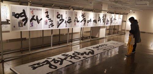 | ▲ 2019년 4월 18일 경남 김해서부문화센터 스페이스 가율에서 열린 '독립열사 말씀 글씨로 보다'전(展)에서 어느 모녀 관람객이 신채호 말씀(역사를 잊은 민족에게 미래는 없다)을 옮긴 글씨를 감상하고 있다. [연합뉴스 자료사진] |