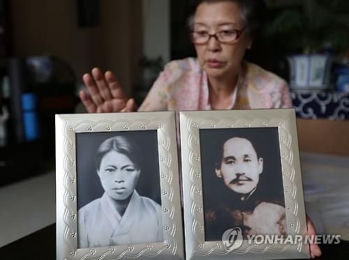 | ▲ 중국 베이징(北京)에 거주하는 이덕남 여사가 시부모인 신채호 선생과 박자혜 여사의 사진 액자를 보여주고 있다. 부인 박 여사도 남편과 함께 구국운동에 투신해 1990년 건국훈장 애족장을 받았다. [연합뉴스 자료사진] |