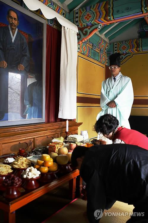 | ▲ 2010년 12월 8일 충북 청주시 신채호 사당에서 열린 신채호 선생 탄신 130주년 기념제전에서 추모객들이 신채호 영정 앞에 절하고 있다. [연합뉴스 자료사진] |