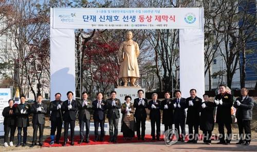 | ▲ 신채호 선생 탄생 139주년을 맞은 2019년 12월 8일 대전시 서대전광장에서 신채호 동상 제막식이 열리고 있다. [대전시 제공. 재판매 및 DB 금지] |