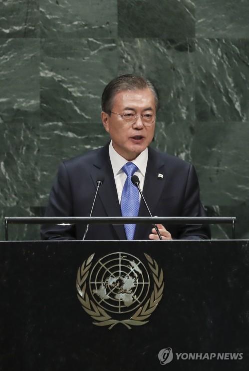 | ▲ South Korean President Moon Jae-in delivers speech at U.N. General Assembly in New York on Sept. 24, 2019. In the address, Moon proposed transforming the Demilitarized Zone, which bisects the Korean Peninsula, into an international peace zone with the help of the United Nations. (Yonhap) |