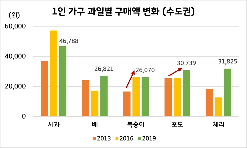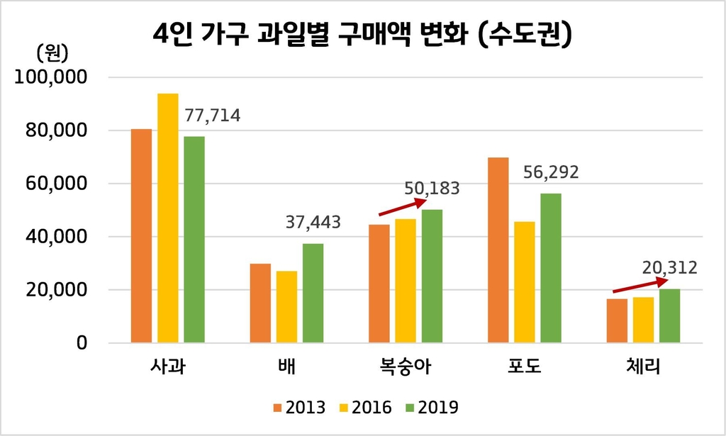 4인 가구는 2013년 대비 2019년에 배, 복숭아, 체리 구매액이 늘었고 1인 가구는 사과, 배, 복숭아, 포도, 체리 등의 구매액이 증가한 것으로 나타났다.