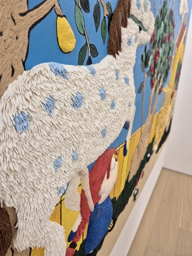 대형 작품들이 많은 이번 전시에서는 다양해진 소재와 함께 바느질을 한 것 같기도 하고 두터운 물감을 파낸 것 같기도 한 마티에르가 더욱 강조된 작품들을 볼 수 있다.