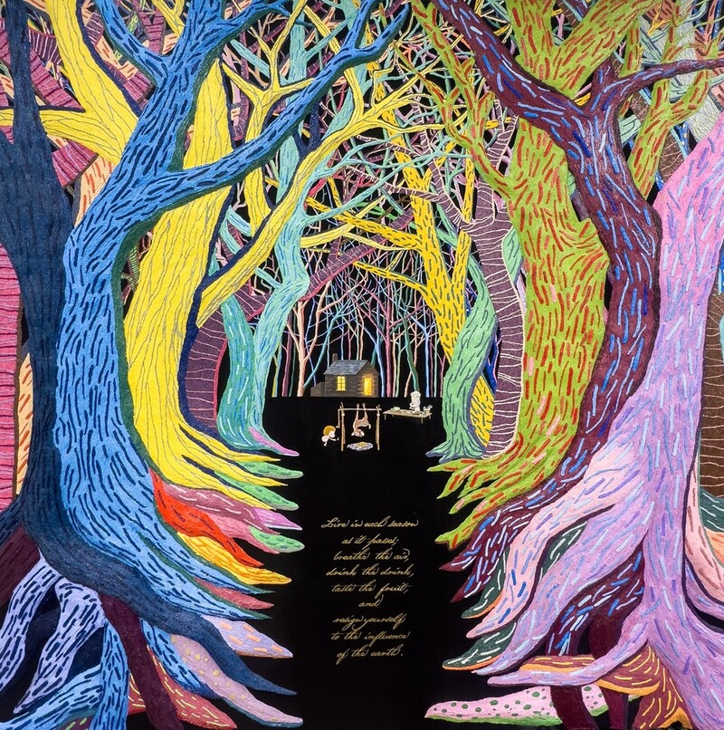 '월든' 시리즈는 미국 사상가이자 시인이었던 헨리 데이비드 소로의 '월든'에서 소재를 가져왔다. 울창한 숲 속 작은 오두막을 배경으로 한 그림에는 작가가 실제 소로의 필기체를 본따 월든 속 문장을 적었다.