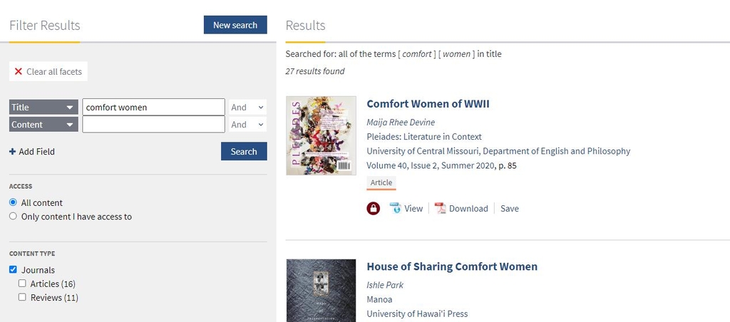 디지털 인문사회학 논문 검색 사이트인 프로젝트뮤즈에 따르면 제목에 'comfort women'이 들어가는 국제저널 논문도 27건에 불과하다.