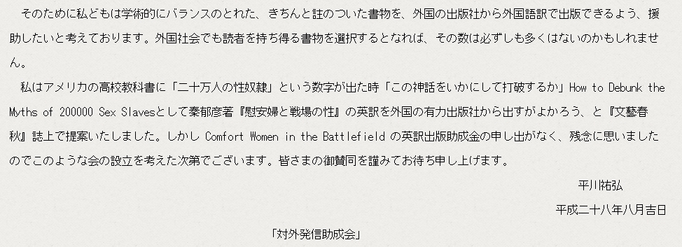 일본 우익세력의 원로인 히라카와 스케히로(平川祐弘) 도쿄대 명예교수가 '미국 고등학교 교과서에 20만 명의 성노예라는 숫자가 나오는 것을 두고 볼 수 없다'는 취지로 '대외발신조성회'라는 단체를 설립한 것이다.