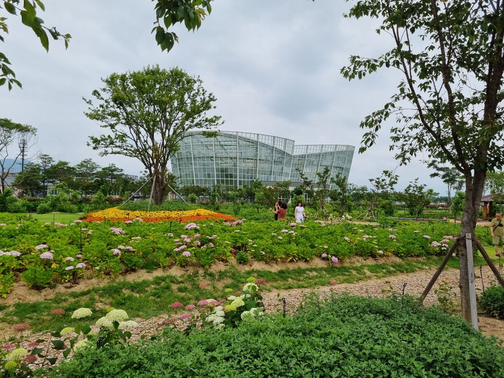 | ▲ 거창창포원 수국과 열대식물원 (거창=연합뉴스) 지성호 기자 = 거창창포원에 핀 수국과 열대식물원. 2021.6.21 shchi@yna.co.kr(끝) |