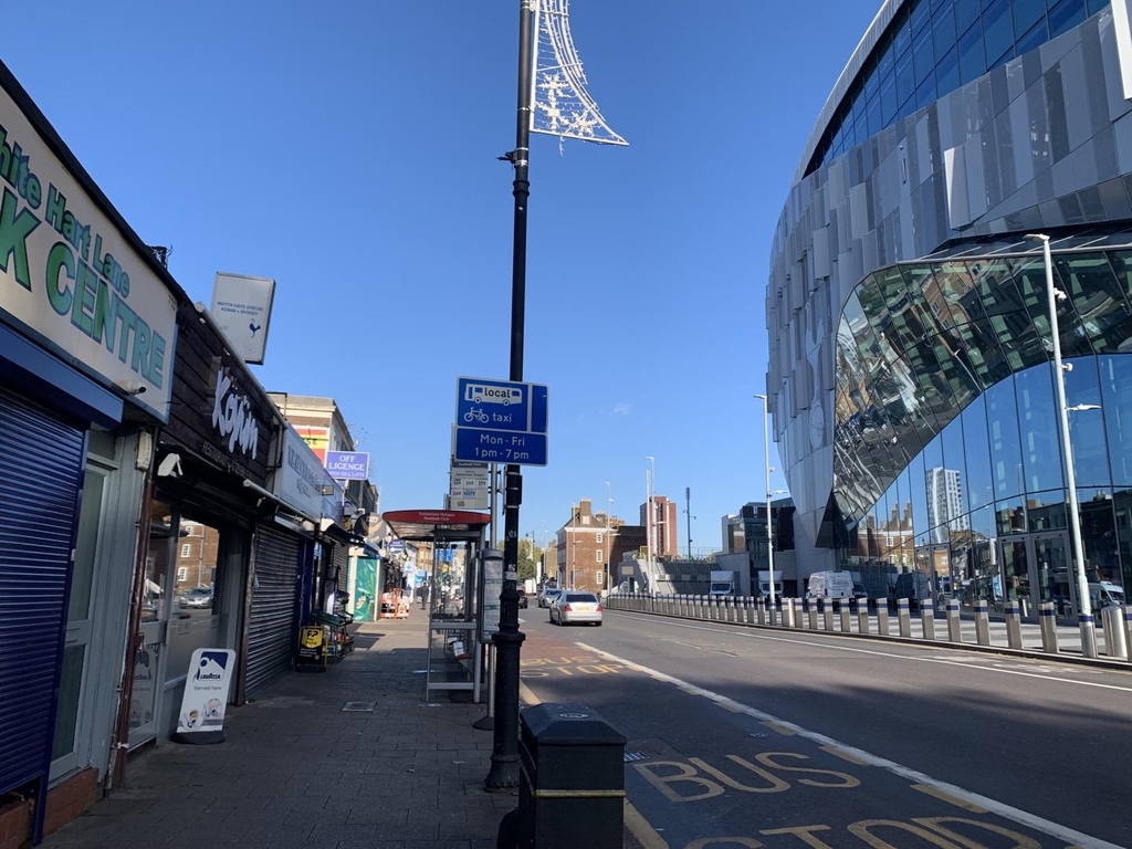 토트넘 스타디움은 런던 도심 트래펄가 광장에서 북동쪽으로 약 40분 거리에 있다. 사실상 왕복 2차로인 좁은 도로에 붙어 있고 맞은편에는 잡화점, 열쇠 복사점 등과 작은 닭 튀김 식당 등이 보인다.