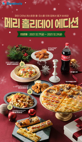 ▲ 도미노피자는 크리스마스 홈파티에 어울리는 세트 메뉴를 출시했다. 이 중 '메리 홀리데이 에디션' 세트는 겨울 신제품 '마스터 트리플 코스피자'와 크리스피 타르타르 치킨, 치킨 버터 커리 파스타, 콜라로 구성됐다.