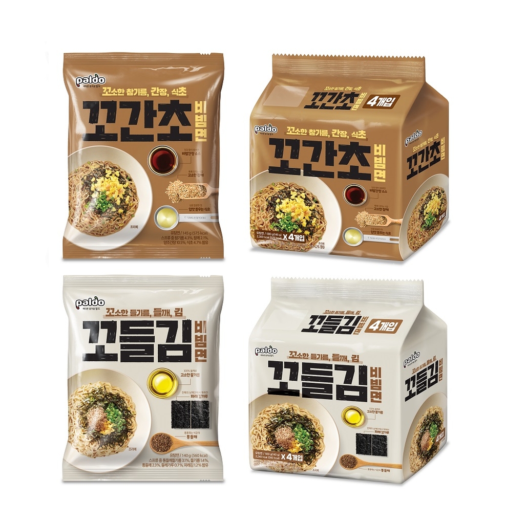 ▲ 팔도가 비빔면 신제품인 꼬들김 비빔면·꼬간초 비빔면 2종을 내놨다. 신제품은 맵지 않은 비빔면이며 꼬들김은 들기름·들깨·김으로, 꼬간초는 참기름·간장·식초로 맛을 냈다.