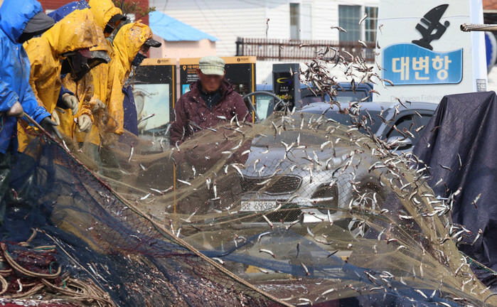 Fishermen and workers from abroad shake anchovies out of a net at Daebyeon port in Gijang, a fishing town in the southeastern port city of Busan, on March 31, 2025. Koreans dry anchovies to create a stock that's used as a major seasoning in many Korean dishes. (Yonhap)