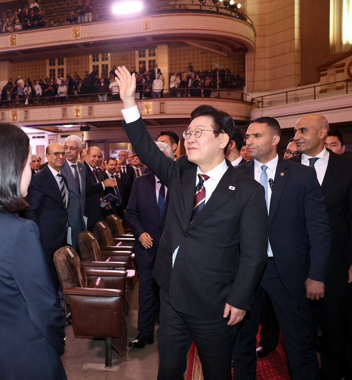 South Korean President Lee Jae Myung (C) reacts after delivering a speech in front of university students at Cairo University in the Egyptian capital on Nov. 20, 2025, outlining South Korea's Middle East initiative. Lee outlined the "SHINE" initiative, which stands for stability, harmony, innovation, network and education, as he underlined his administration's commitment to strengthening ties with the region -- crucial for energy security, trade and other areas of cooperation. (Yonhap)