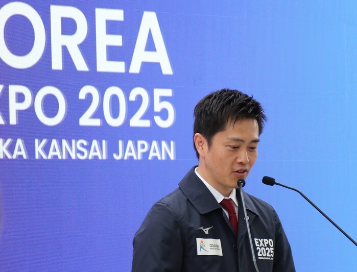 Osaka Gov. Hirofumi Yoshimura speaks during the inauguration ceremony for South Korea's pavilion on the opening day of the 2025 World Exposition on an artificial island in Osaka, western Japan, on April 13, 2025. (Yonhap)
