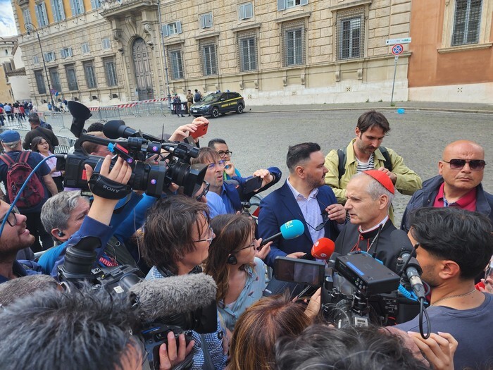 Algerian Cardinal Jean-Paul Vesco (2nd from R) meets the press at St. Peter's Square in Vatican City on May 6, 2025, after attending the General Congregation in preparation for the upcoming conclave that starts the next day to elect the next pontiff of the Roman Catholic Church. (Yonhap)