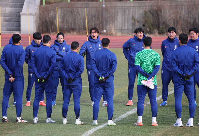 South Korean men's national football coach Hong Myung-bo (C, rear) gives instructions to his players as the team trains at Goyang Stadium in Goyang, northwest of Seoul, on March 17, 2025, ahead of a 2026 World Cup third-round qualifier against Oman on March 20. (Yonhap)