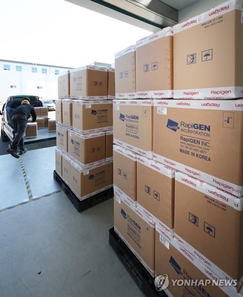 ▲ An employee loads boxes containing COVID-19 self-test kits on a truck at RapiGen in Suwon, 45 kilometers south of Seoul, on Jan. 28, 2022, with demand for them mounting amid the rapid spread of the omicron variant