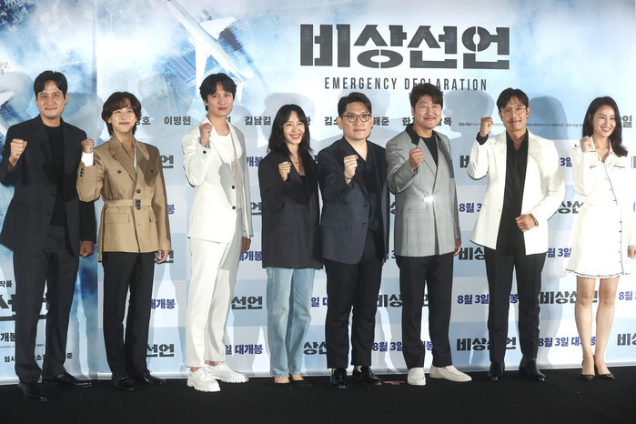 The stars of the new movie "Emergency Declaration" -- (from L to R) Park Hae-jun, Im Si-wan, Kim Nam-gil, Jeon Do-yeon, Song Kang-ho, Lee Byung-hun and Kim So-jin -- along with director Han Jae-rim (5th from L) -- pose for a photo during a publicity event in Seoul on July 25, 2022. The movie will be released in South Korea on Aug. 3. (Yonhap)