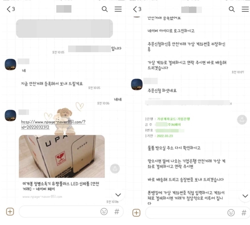 A씨 측은 "메신저 프로필에 가족사진까지 걸어두고 네이버 안전거래를 이용하자며 안심시킨 뒤 가짜 사이트 링크를 보내 돈을 뜯어내고선 연락을 차단했다"면서 "사기 정보 공유 사이트 더치트를 통해 검색해보니 같은 계좌번호를 사용한 판매자에게 사기를 당했다는 이들이 50명을 넘는다"고 했다.