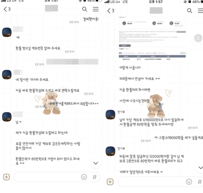 그는 "환불해 주려고 하는데 요즘 안전거래 가상계좌로 검은돈 세탁하는 사람들이 많아서 환불 단위가 80만원으로 지정되어 있다고 한다"며 "환불받으려면 가상계좌로 69만8천원을 더 입금해 환불금액 80만원을 맞춰줘야 한다"고 했다.
