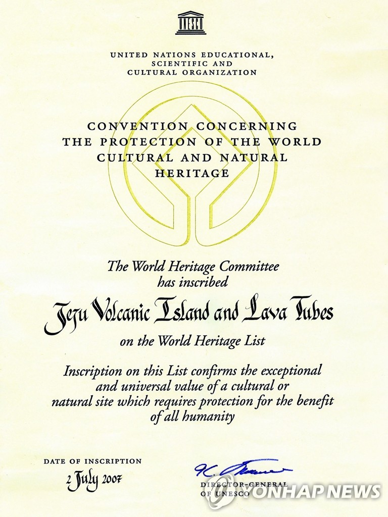 | ▲ 제주에 온 '세계자연유산 인증서' (제주=연합뉴스) 유네스코(UNESCO) 세계유산센터가 외교통상부와 문화재청을 거쳐 제주도에 전달한 '제주 화산섬과 용암동굴(Jeju Volcanic Island and Lava Tubes)'에 대한 세계자연유산 인증서. [연합뉴스 자료사진] |