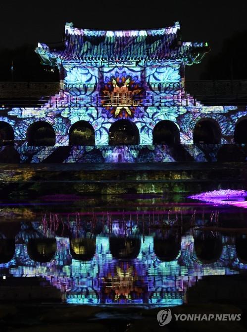 | ▲ Hwaseong Fortress, a UNESCO cultural heritage site in Suwon, about 30 kilometers south of Seoul, is illuminated with a variety of colors on Sept. 21, 2022, in a rehearsal for one of several festivals involving the fortress. (Yonhap) |