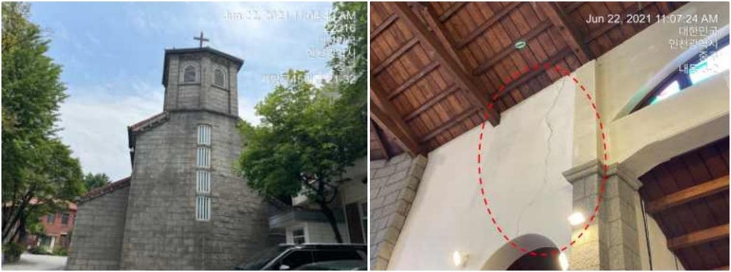 | ▲ 성공회성당 전경(왼쪽)과 균열이 보이는 내부 [인천시 제공, 재판매 및 DB 금지] |