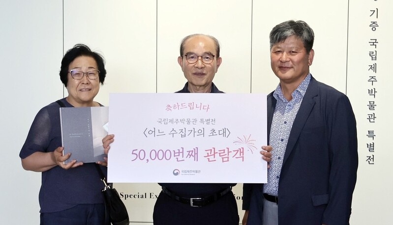 (제주=연합뉴스) 국립제주박물관은 '어느 수집가의 초대-고 이건희 회장 기증 특별전' 5만번째 관람객인 제주시에 사는 고성범 씨에게 특별전 도록과 소정의 문화상품을 증정했다고 16일 밝혔다.