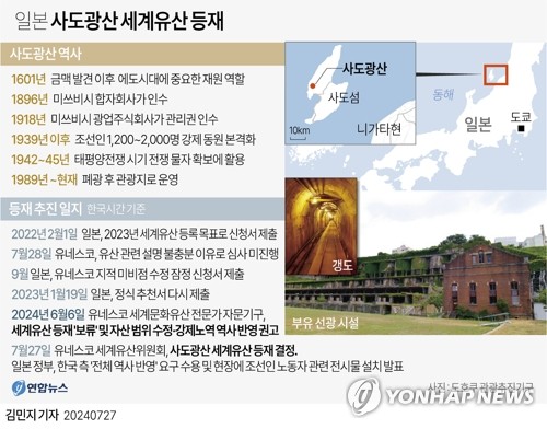 | ▲ [그래픽] 일본 사도광산 세계유산 등재 (서울=연합뉴스) 김민지 기자 = 일제강점기 조선인 강제노역 현장인 일본 사도광산이 27일(한국시간) 유네스코 세계유산으로 등재됐다. minfo@yna.co.kr 트위터 @yonhap_graphics 페이스북 tuney.kr/LeYN1 |