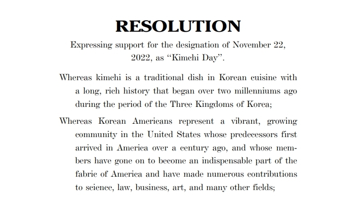 앞서 캘리포니아와 버지니아, 뉴욕이 주(州) 차원에서 김치의 날을 기념일로 선포했지만, 미국 연방 차원에서 공식 기념일로 지정하려는 시도는 이번이 처음이다.