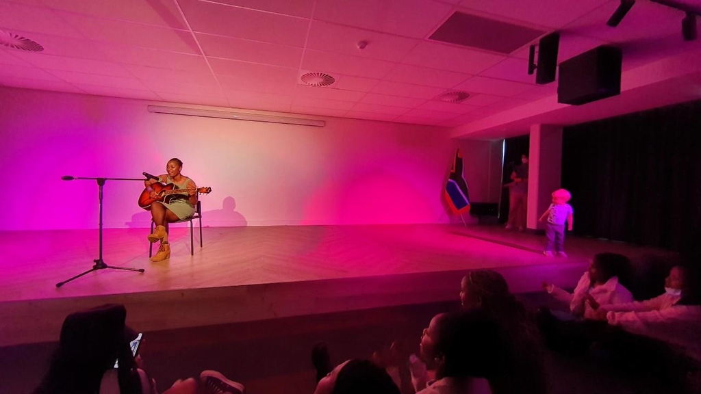 | ▲ K-팝 노래를 단상 위에 올라가 듣는 꼬마 (프리토리아=연합뉴스) 김성진 특파원 = 27일(현지시간) 주남아공 문화원에서 열린 한류 문화 축제 중 교사인 리나(왼쪽)가 유창하게 K-팝을 부르자 한 백인 꼬마가 단상에 올라가 유심히 듣고 있다. 2022.8.27 sungjin@yna.co.kr |