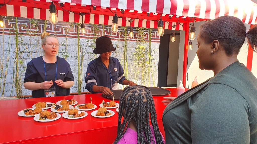 | ▲ 한국 음식 포장마차 (프리토리아=연합뉴스) 김성진 특파원 = 27일(현지시간) '한류 축제 2022'에 온 손님들이 포장마차에서 나눠주는 핫도그식 김치볶음밥, 김밥, 닭강정 접시를 받고 있다. 2022.8.27 sungjin@yna.co.kr |