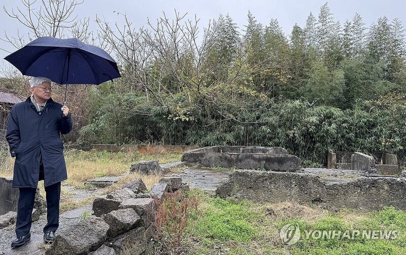 | ▲ 일본 사도광산 조선인 노동자 기숙사 터 (도쿄=연합뉴스) 윤덕민 주일 한국대사가 1일 일본 니가타현 사도시에서 사도광산 조선인 노동자 기숙사 터를 살펴보고 있다. 일본은 조선인 강제노역 현장인 사도광산의 유네스코 세계유산 등재를 추진하고 있다. 2023.12.1 [주일 한국대사관 제공. 재판매 및 DB 금지] photo@yna.co.kr |