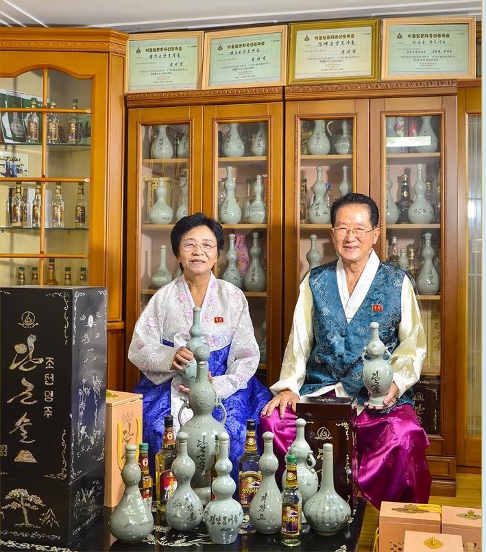 | ▲ 북한 전통주를 발굴, 복원한 황경숙·김원범씨 (서울=연합뉴스) 대외선전매체 내나라는 2021년 10월 26일 "역사의 이끼 속에 묻혀있던 민족의 옛 명주들, 이것을 되살린 주인공들은 평양시 평천구역에서 살고 있는 김원범, 황경숙 노인들"이라고 보도했다. 사진은 단군술 등을 들고 있는 황경숙(왼쪽) 김원범(오른쪽) 부부. [내나라 캡처] |