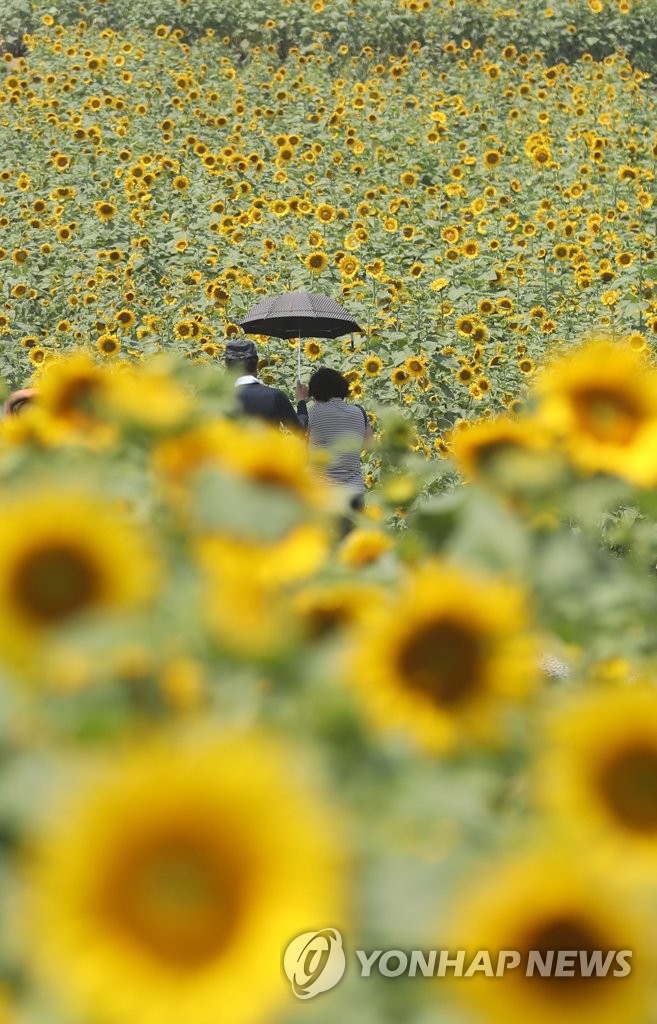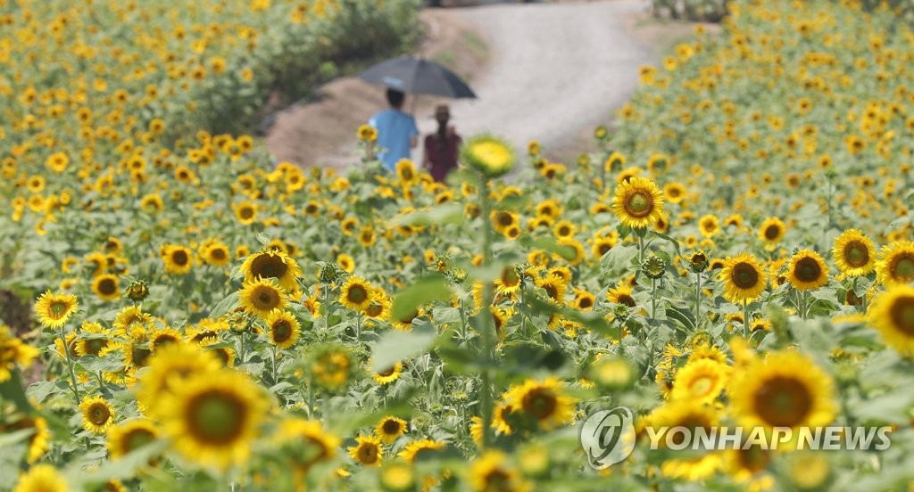 | ▲ 무더위 속 해바라기 활짝 (함안=연합뉴스) 김동민 기자 = 폭염이 이어진 20일 오후 우산을 쓴 시민들이 경남 함안군 강주마을을 방문해 해바라기를 구경하고 있다. 제6회 강주 해바라기축제는 21일부터 오는 8월 5일까지 함안 강주마을 일원에서 열린다. 2018.7.20 image@yna.co.kr |