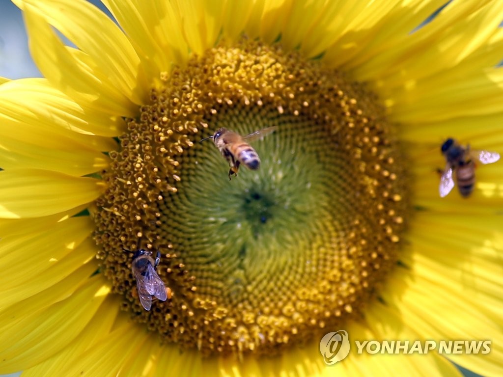 | ▲ 쉿! 꿀 먹는 중 (함안=연합뉴스) 김동민 기자 = 폭염이 이어진 20일 오후 벌이 경남 함안군 강주마을 해바라기 속에서 꿀을 먹고 있다. 제6회 강주 해바라기축제는 21일부터 오는 8월 5일까지 함안 강주마을 일원에서 열린다. 2018.7.20 image@yna.co.kr |
