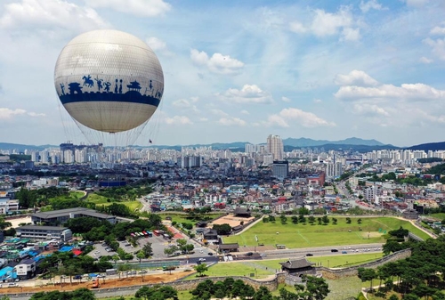 | ▲ 관광용 헬륨기구 '플라잉수원'과 행궁동 일대 [수원시 제공] |
