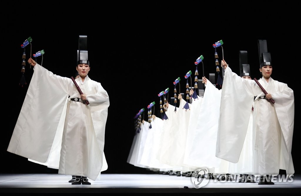 | ▲ 창작공연 '일무' 중 '춘앵무' (서울=연합뉴스) 이재희 기자 = 25일 오후 서울 종로구 세종문화회관 대극장에서 열린 공연 '일무' 프레스콜 행사에서 서울시무용단이 공연 일부를 시연하고 있다. 종묘제례악 의식 무용을 모티프로 한 이 창작공연은 이날부터 나흘간 세종문화회관 대극장에서 열린다. 2023.5.25 scape@yna.co.kr |