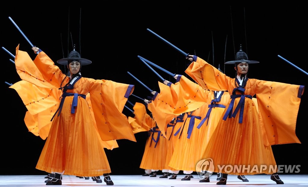(서울=연합뉴스) 강애란 기자 = 선명한 주황색 무관 의상을 입은 무용수 18명이 일렬로 서서 손에 쥔 검을 차례대로 어깨너머로 돌린다. 민첩한 움직임이 한 치의 오차도 없이 칼군무를 만들어내는 순간, 넓은 소맷자락이 펄럭이며 주황색 파도를 일으킨다.