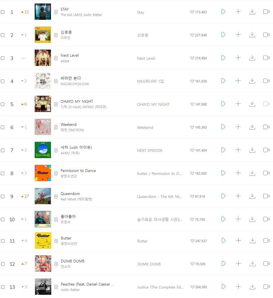 20일 가요계에 따르면 전날 기준 힙합 아티스트 더 키드 라로이(The Kid Laroi)와 저스틴 비버가 협업한 곡 '스테이'(Stay)는 국내 최대 음원 사이트인 멜론 일간 차트에서 2위를 기록했다.
