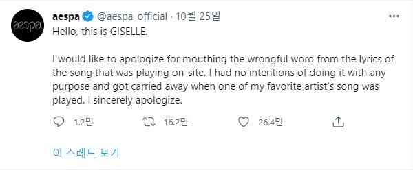 ▲ 에스파 지젤 사과문 [에스파 공식 트위터 캡처.]