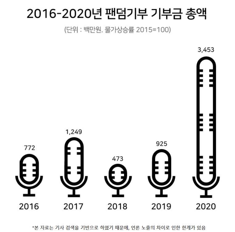 9일 연합뉴스가 입수한 아름다운재단 기부문화연구소와 미국 인디애나 대학 릴리 패밀리 필란트로피 스쿨의 연구 자료에 따르면 이들 단체는 웹 크롤링(자동 데이터 수집) 기법으로 최근 5년간 국내 팬덤기부 규모를 분석했다.