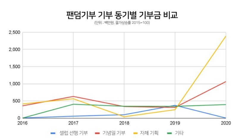 2016∼2017년에는 유명인의 이미지와 브랜드를 홍보하기 위한 기념일 관련 기부가 주를 이뤘으나, 2019년부터는 팬덤 스스로 유명인과는 별개로 기획한 기부를 실천하는 '팬덤기부 문화'가 정착하는 모습으로 바뀐 것으로 분석됐다.