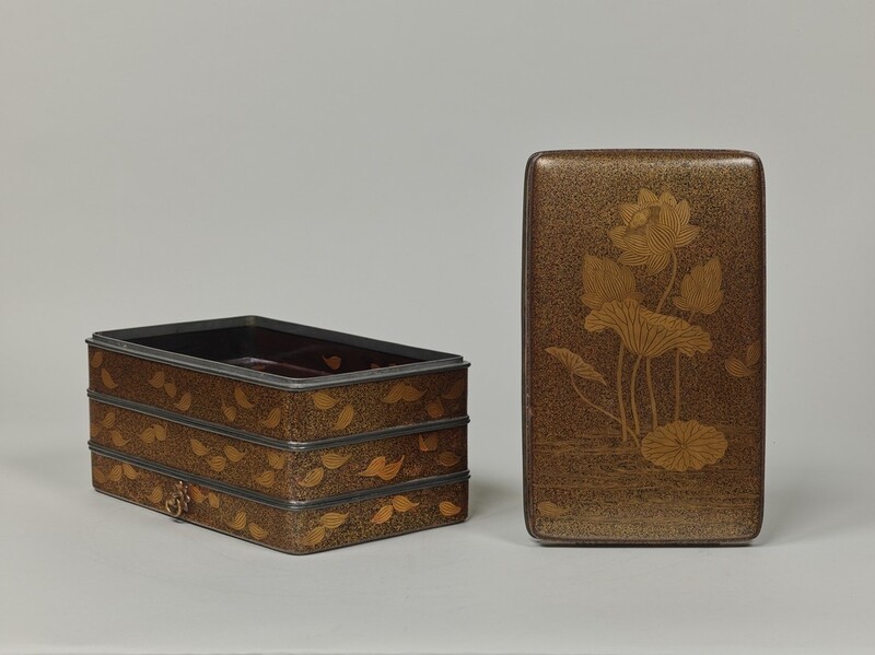 반면 일본의 대표적인 칠공예 기법인 마키에(蒔繪) 기법은 옻칠한 기물 위에 금가루를 정교하게 가공해 뿌리는 방식으로 장식하는 점이 특징이다.