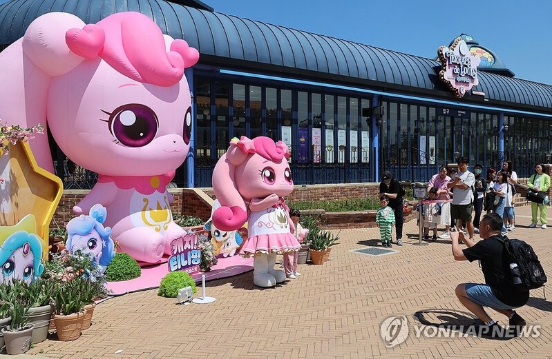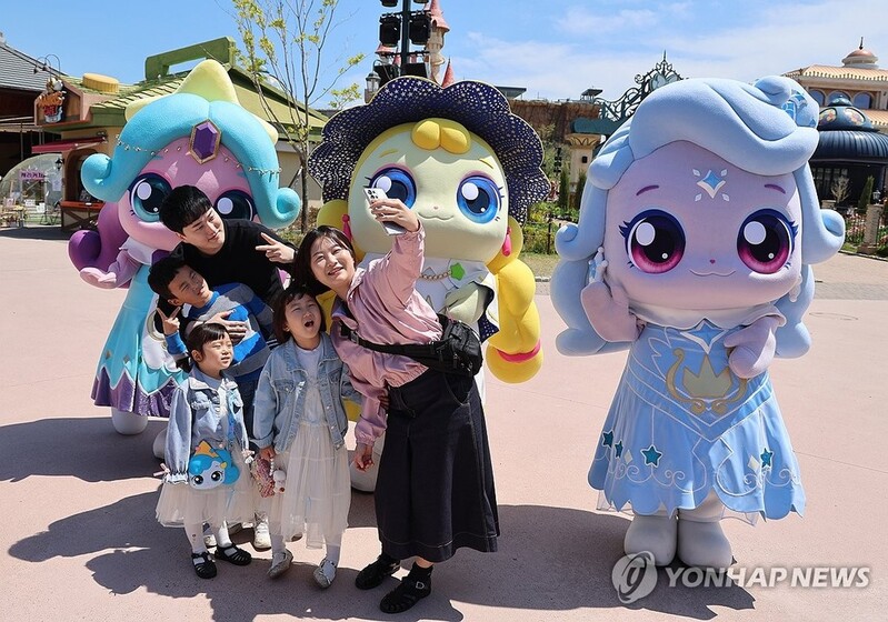 ▲ 인기 캐릭터 티니핑과 '한 컷' (부산=연합뉴스) 강선배 기자 = 지난달 28일 부산 기장군 롯데월드 어드벤처 부산을 찾은 한 가족이 인기 캐릭터 '티니핑'과 기념사진을 찍고 있다. |