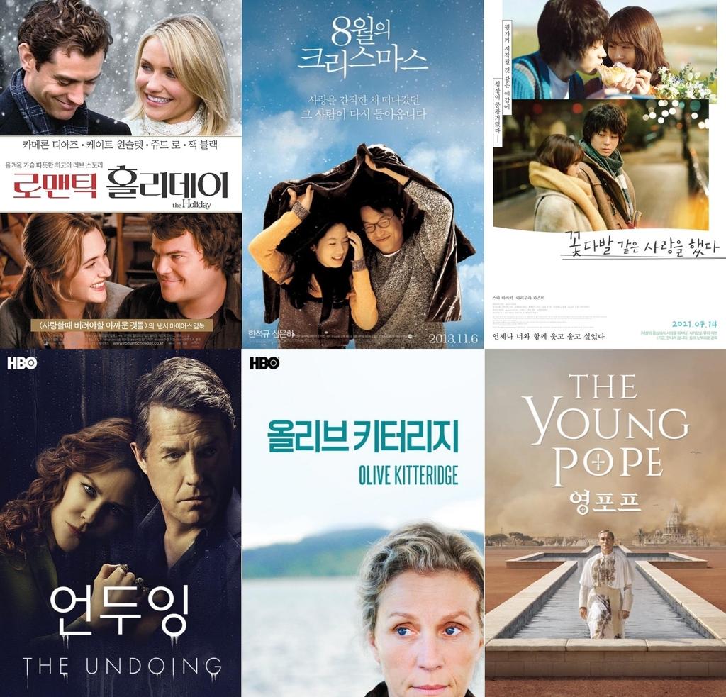 ▲ 웨이브 크리스마스 추천작 (왼쪽 위부터 시계방향으로) 영화 '로맨틱 홀리데이'·'8월의 크리스마스'·'꽃다발 같은 사랑을 했다', 해외 시리즈 '영 포프'·'올리브 키터리지'·'언두잉'