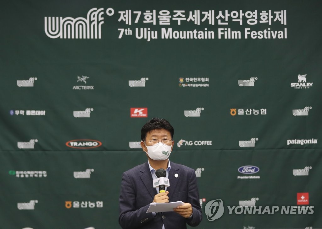 | ▲ 발언하는 이선호 울주세계산악영화제 이사장 (울산=연합뉴스) 김용태 기자 = 23일 오전 울산시청 프레스센터에서 열린 제7회 울주세계산악영화제 개최 기자회견에서 영화제 이사장인 이선호 울주군수가 발언하고 있다. 2022.3.23 yongtae@yna.co.kr |