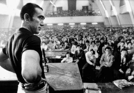| ▲ 미시마 유키오가 1969년 5월 13일 일본 도쿄대 강당에서 전공투 핵생들과 논쟁을 벌이고 있다. [출처 위키피디아] |