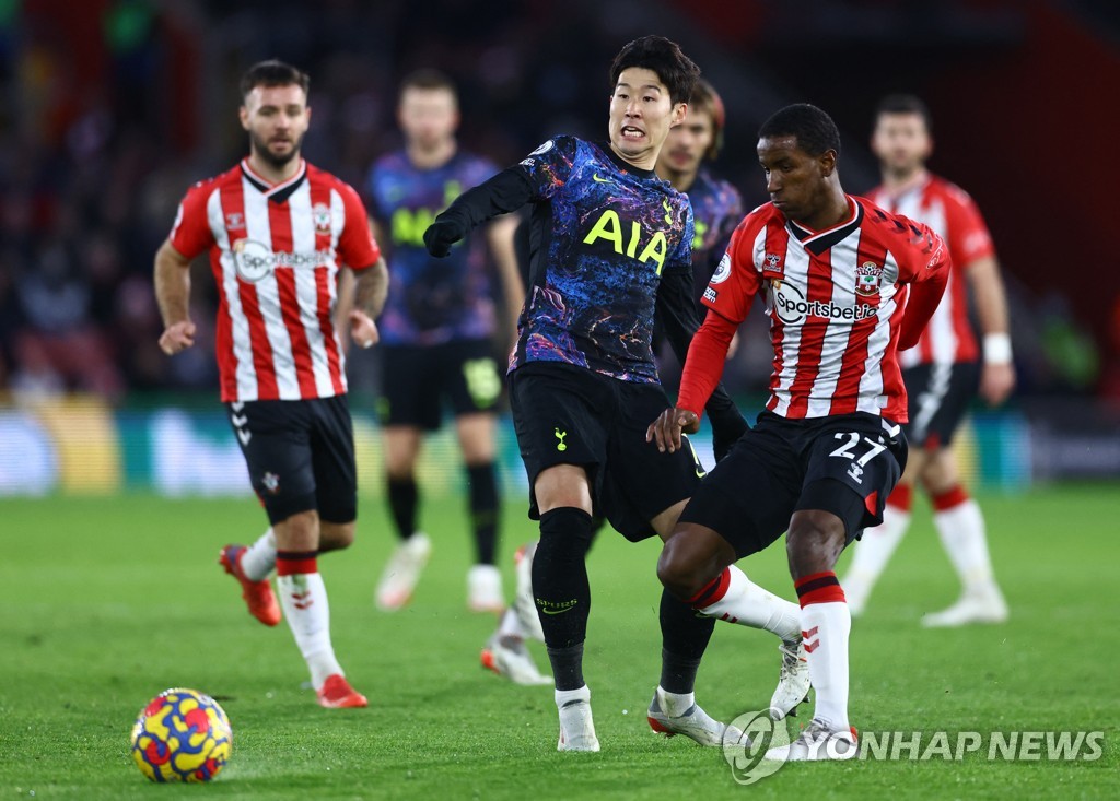 | ▲ In this Reuters photo, Son Heung-min of Tottenham Hotspur (L) and Romain Perraud of Southampton battle for the ball during a Premier League match at St Mary's Stadium in Southampton, England, on Dec. 28, 2021. (Yonhap) |
