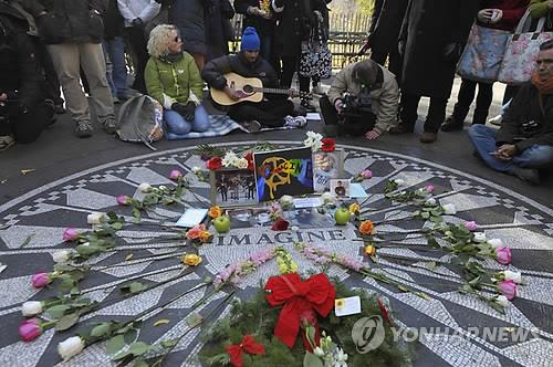 | ▲ 미국 뉴욕 센트럴파크에 꾸며진 존 레넌 추모 공간 '스트로베리 필즈'에는 레넌의 대표곡 'Imagine'이 모자이크로 새겨져 있다. 2010년 12월 8일 레넌 30주기를 맞아 한 아이가 꽃을 바치고 있다. [연합뉴스 자료사진] |