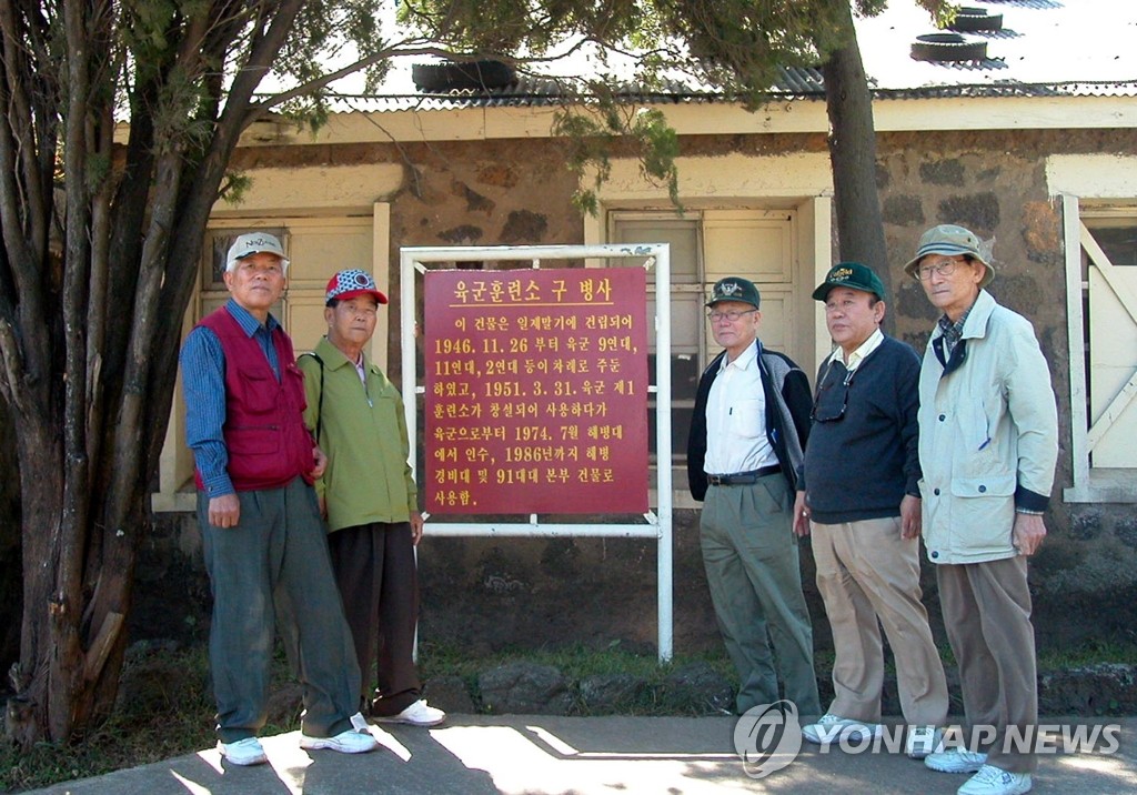 | ▲ 50년만에 제주 훈련소 찾은 노병들 (제주=연합뉴스) 지난 2004년 10월 15일 6·25 한국전쟁 당시 제주도 모슬포 육군 제1훈련소에서 정훈을 맡았던 70대 노병들이 50년여만에 훈련소를 찾았다. [연합뉴스 자료사진] |